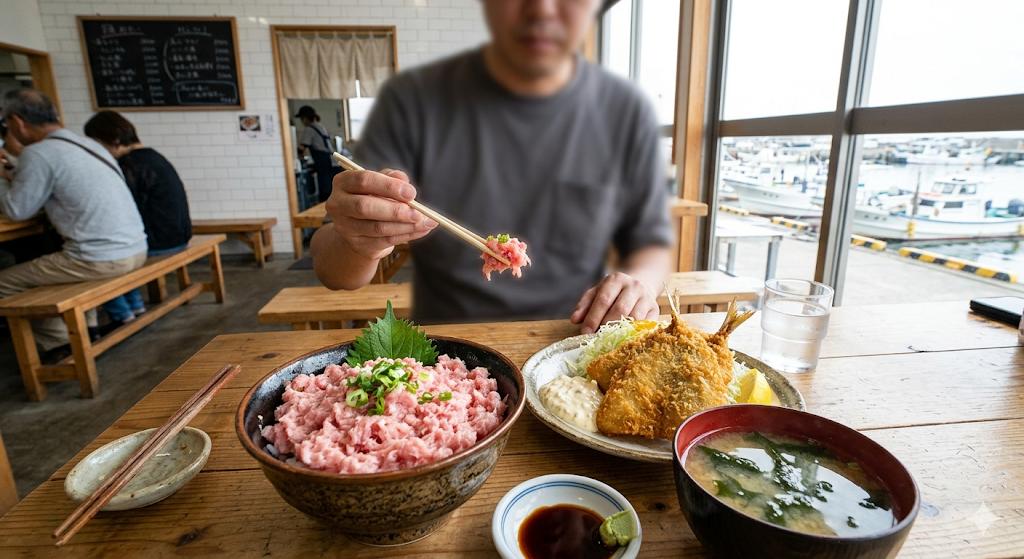 【飯テロ】千葉・木更津の市場めしが最強すぎる件!生本マグロ中落ち丼と激ウマ鯵フライで朝から優勝確定www